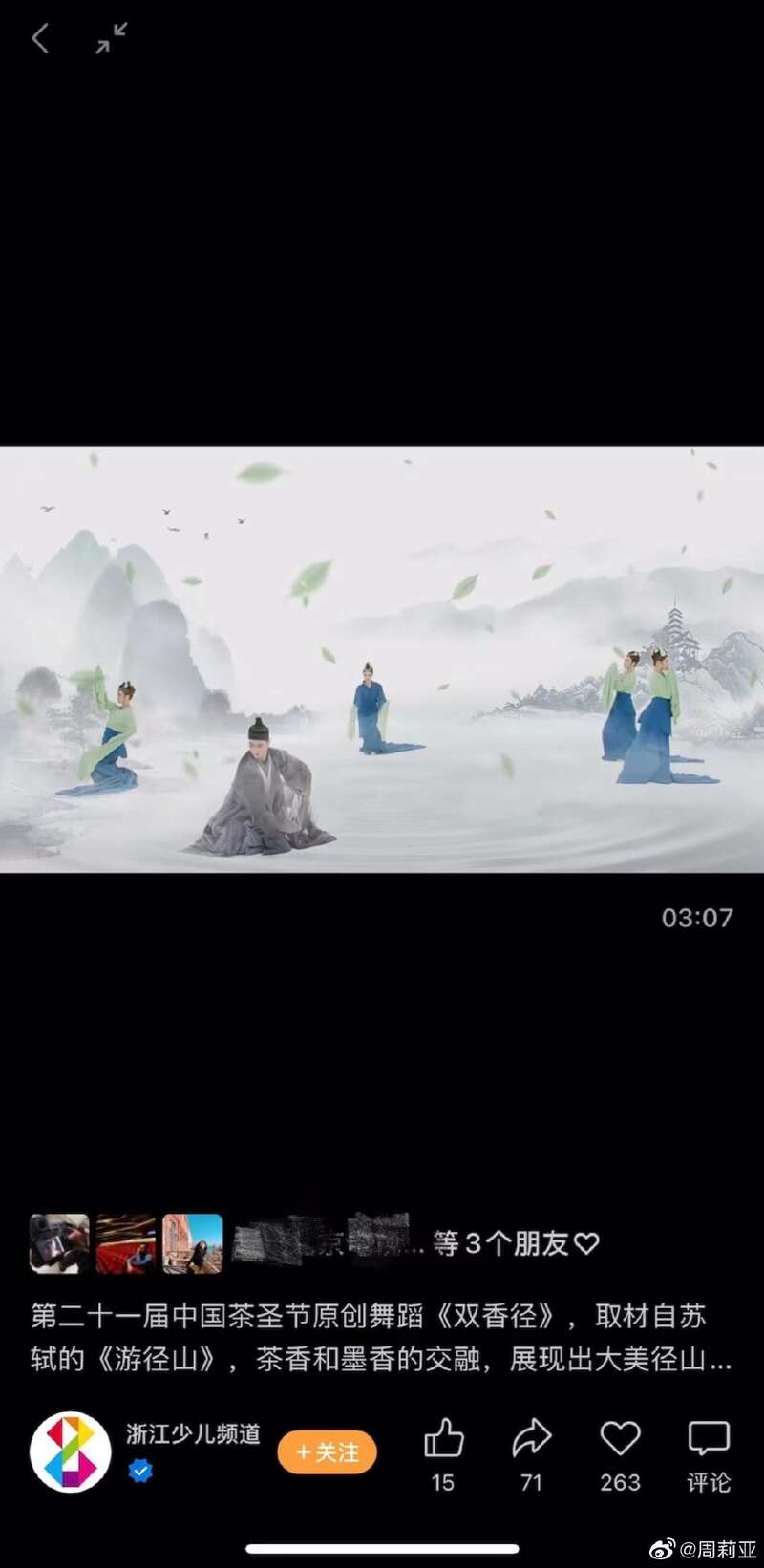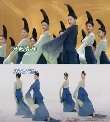 而这些特征在《双香径》中亦有体现。5月22日,浙江电视台少儿频道的视频号发布一条舞蹈节目视频《双香径》,并介绍是“第二十一届中国茶圣节原创舞蹈”,取材于苏轼的《游径山》。从视频中可看到,其舞蹈动作和服装设计与《只此青绿》极为相似。