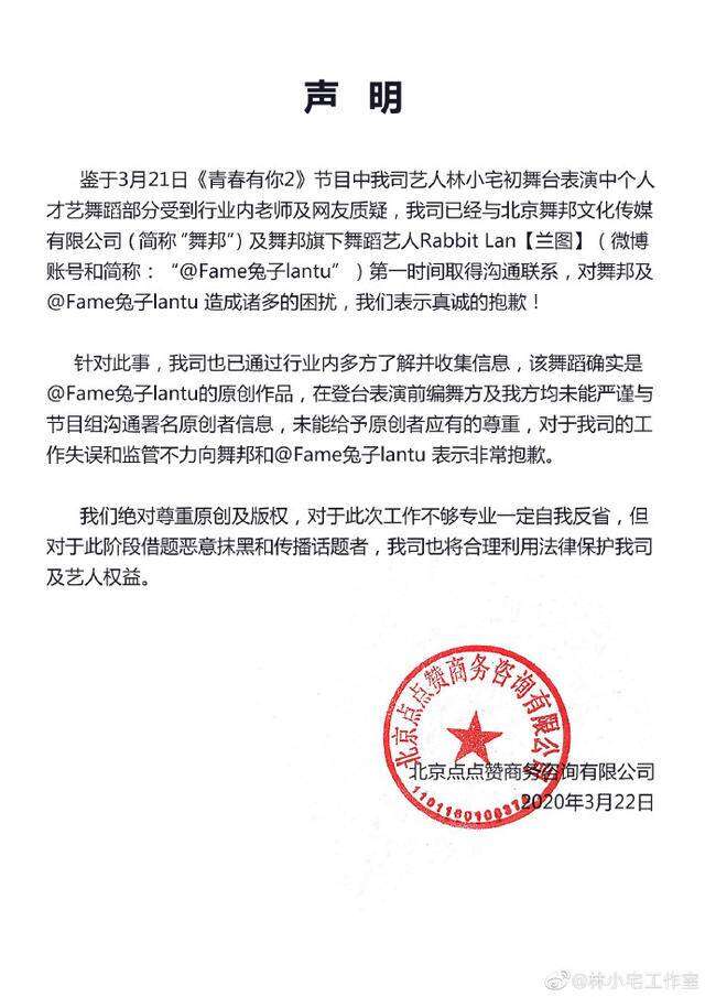 2020年,《青春有你2》中的训练生林小宅在初舞台表演了舞蹈“美少女变身”,随后有网友发现,该节目的舞蹈涉嫌抄袭舞邦导师兔子的原创编舞《美少女战士变身》。