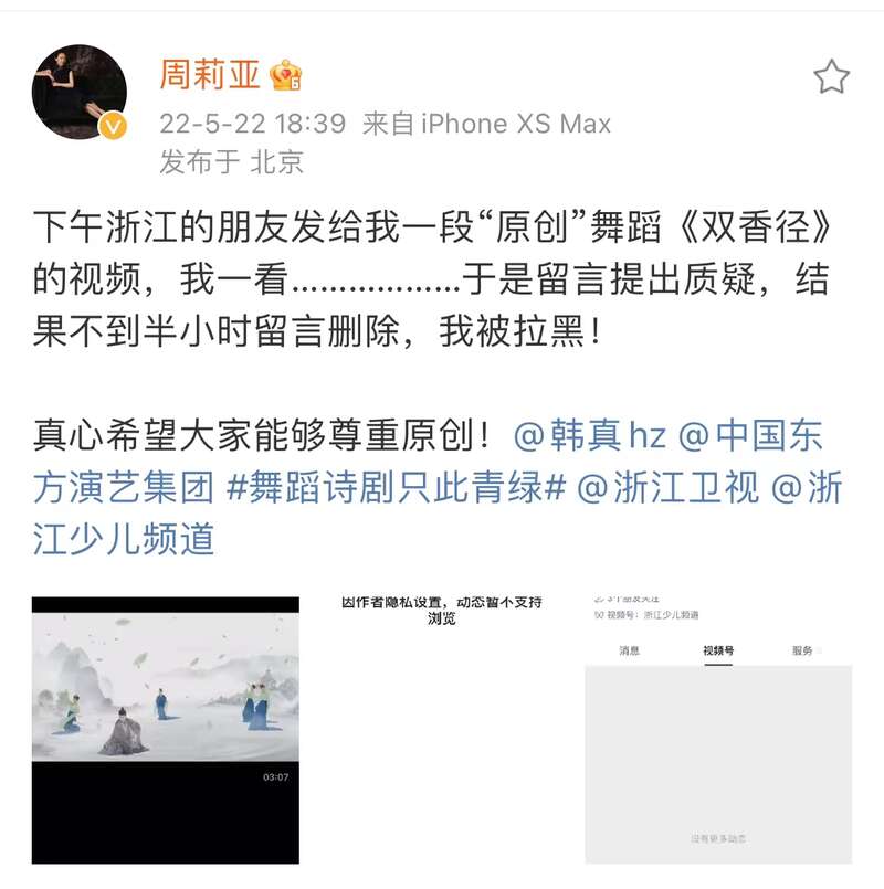 “下午浙江的朋友发给我一段‘原创’舞蹈《双香径》的视频,我一看……真心希望大家能够尊重原创!”5月22日,《只此青绿》总编导周莉亚在微博发文,直指舞蹈《双香径》抄袭《只此青绿》。