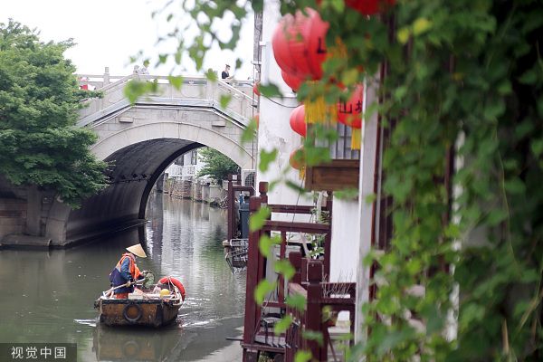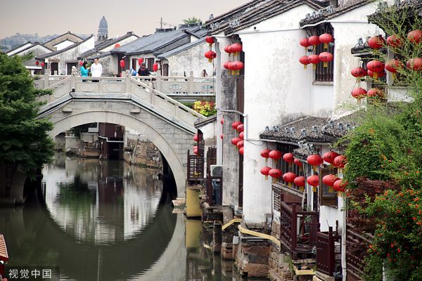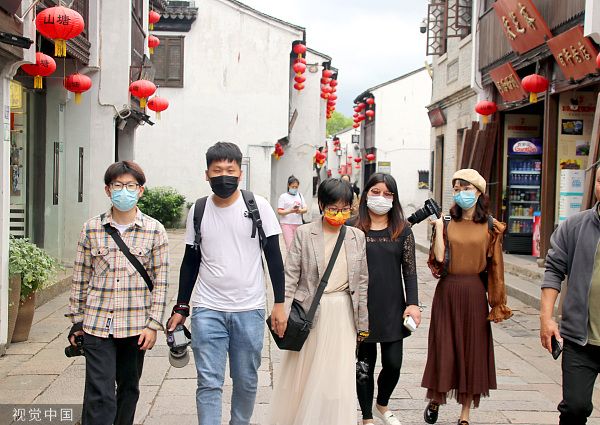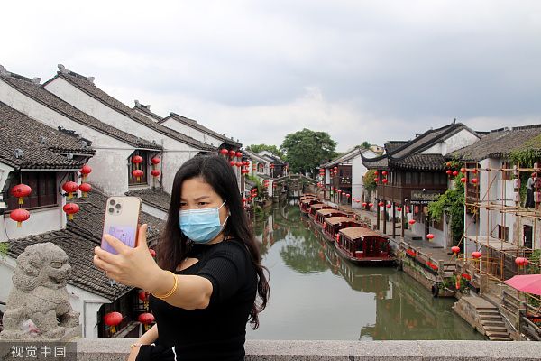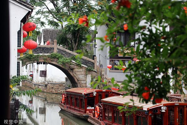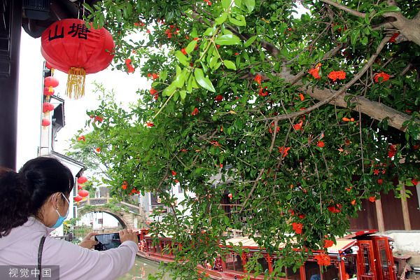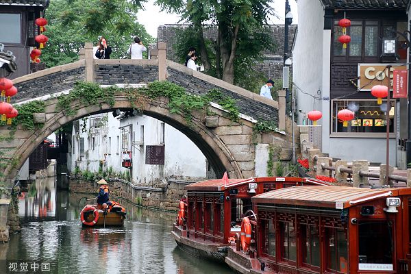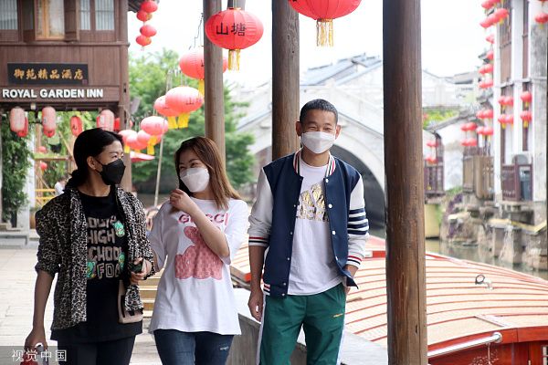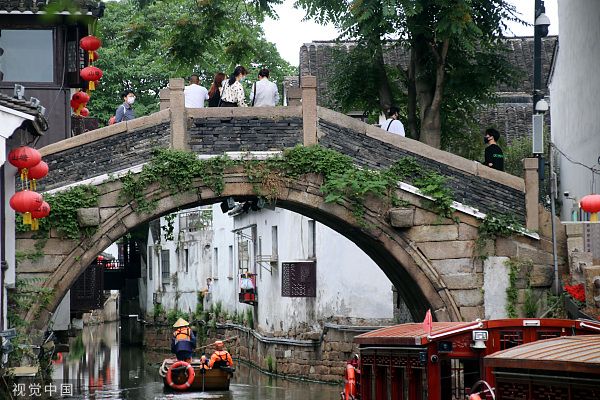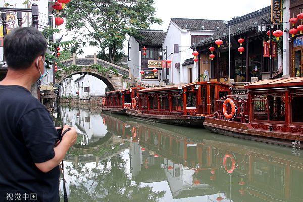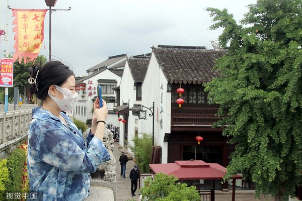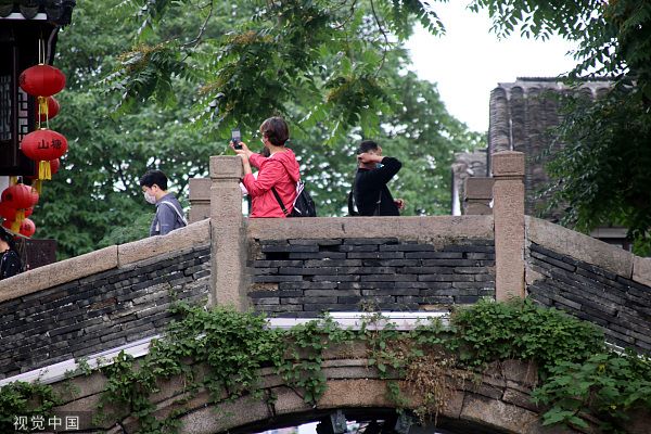 2022年5月24日,游客在江苏苏州山塘古街游览。当日,江苏苏州山塘古街人气有序回归,人们有序逛街、购物、游玩,古街旅游稳步复苏回暖。