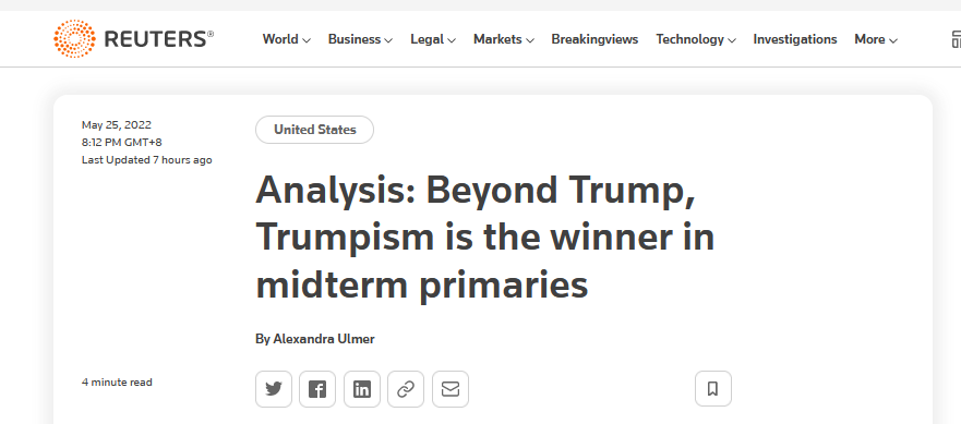 路透社在5月25日的评论中称,特朗普施加的影响力正持续影响着共和党。尽管在各地的初选中,特朗普支持的候选人选情好坏参半,但越来越多的共和党候选人和选民正在转向“特朗普主义”(Trumpism),大搞民粹主义以赢得选民。