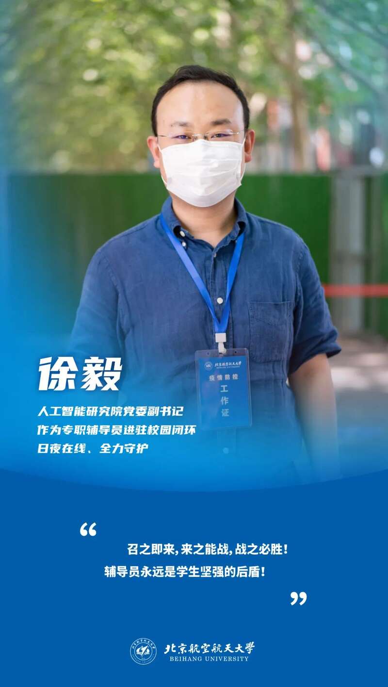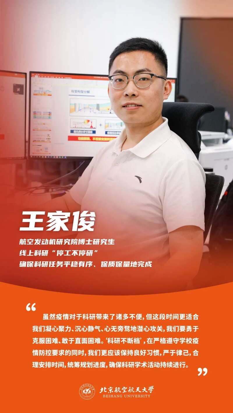 封闭管理期间,王家俊始终奋斗在科研一线。他争分夺秒,不失守任何一个进展节点;他克服不便,各方协调保证项目顺利进行。笃志研学、步履不停,这是北航研究生的写照;毫不松懈、直面考验,这是北航研究生的风采。