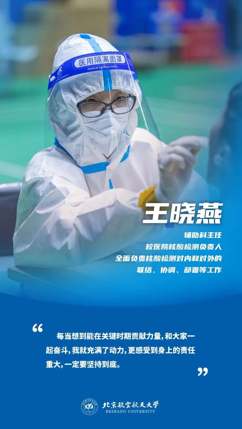 截至目前,北航的75位“大白们”共参与24轮62万人次的两校区全员核酸检测。32位“大白们”进驻教学区闭环工作,没有轮换,咬牙坚持,擦干汗水,持续奋斗,他们用实际行动践行着医务人员的担当,守护一方校园。