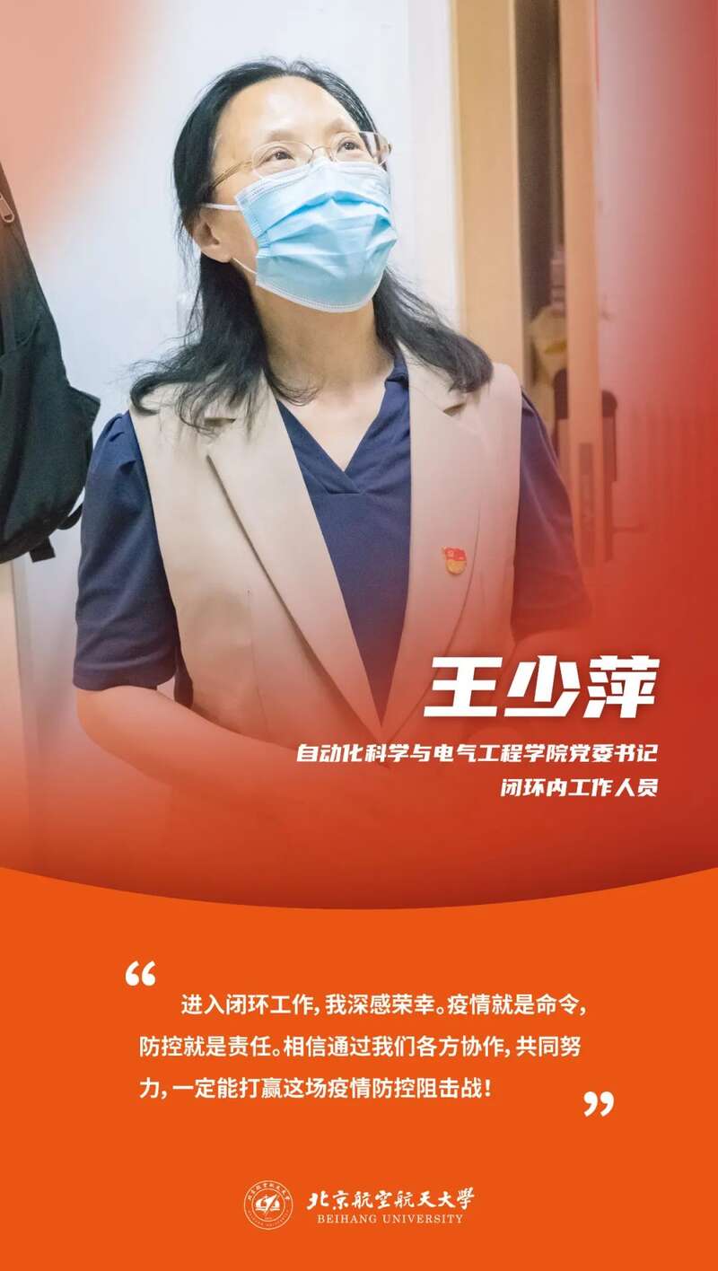 自动化科学与电气工程学院党委书记王少萍主动进入校园闭环,带领学院专兼职辅导员勇上一线。她第一时间走访学生宿舍、教研室,近距离了解学生上网课、科研、求职情况,帮助大家解决实际困难;第一时间报名担任大运村盒饭售卖志愿者、体育馆核酸检测志愿者,勇于担当、奋勇争先。
