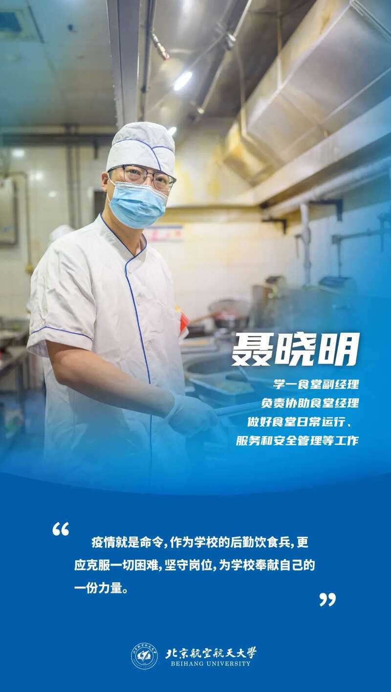 聂晓明与同事合作,做好食堂日常运行、服务和安全管理工作。他努力提升食堂员工服务质量与产品质量,同时做好食堂成本核算与设备设施更新工作,力求为老师与同学们提供更好的就餐体验。