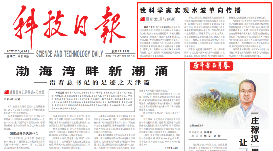 近日,厦门大学陈焕阳教授课题组借鉴人工表面等离激元的理论方法,在水波局域现象研究取得重要突破,提出水波极化激元新概念,并通过设计的超材料结构实现水波的单向传播。国际期刊《物理评论快报》对相关成果进行了重点报道。