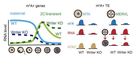 高绍荣介绍,团队利用高通量测序法首次绘制了小鼠早期胚胎发育过程中转录本上m6A修饰的动态图谱,并证实了母源的转座子MTA和2-细胞时期转座子MERVL具有高度的m6A修饰富集。研究进一步发现m6A修饰分别维持了卵母细胞中母源RNA的稳定性,以及受精后短暂表达的转录本的及时降解。m6A修饰在卵母细胞和合子基因激活阶段不同的调控功能体现了生命初始阶段调控的复杂性,并为进一步探究生命调控奥秘开辟了全新视域。