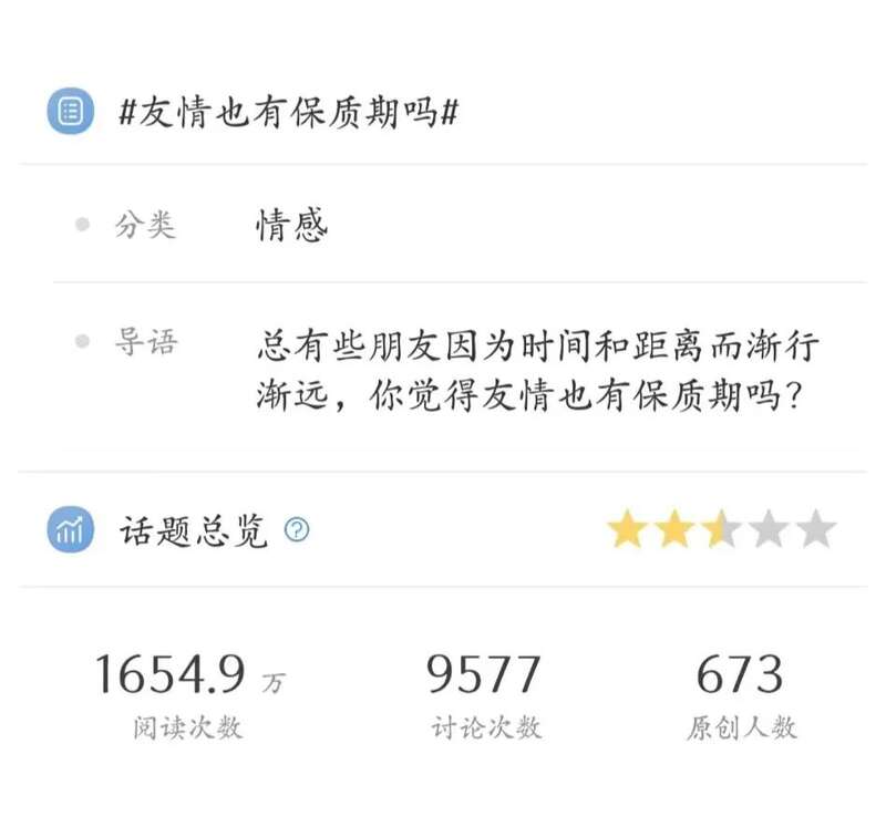 友情,作为我们日常生活中永恒的话题。有的人为拥有一段热烈而经久的友情深表幸运,也有人因失去一位趣味相投的朋友倍感遗憾。“友情也有保质期吗?”这一微博话题冲上热搜,勾出了无数网友们关于友情的独家记忆。