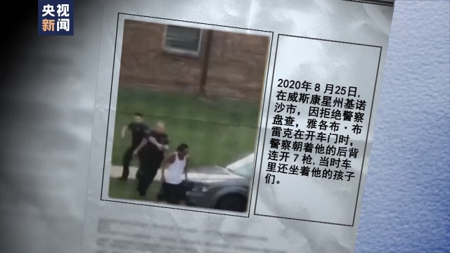 2020年8月25日,在威斯康星州基诺沙市,因拒绝警察盘查,雅各布·布雷克在开车门时,警察朝着他的后背连开7枪。当时车里还坐着他的孩子们。
