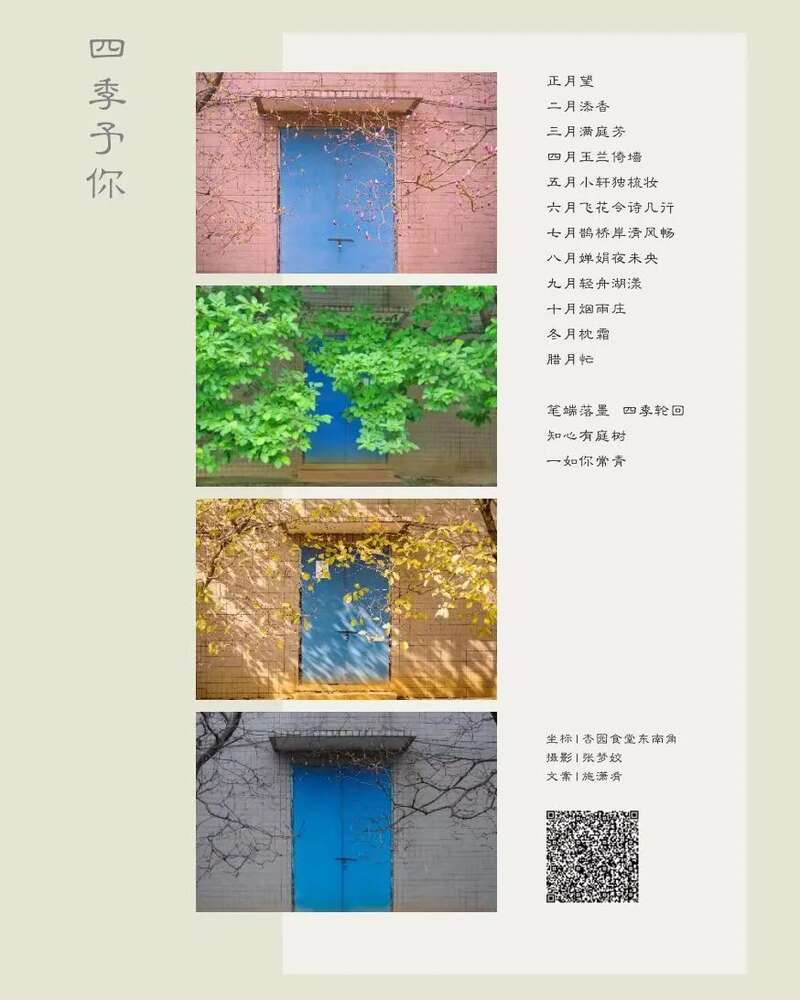 她曾数次驻足杏园食堂东南角的小蓝门,看门前的花树开了又败,败了又开,四时自有其序。她坦言,自己并不相信“天道酬勤”,但她始终在做跟着时间走的人,向着属于她的远方,不紧不慢、步履从容。“时间很任性,这一刻没能得到想要的结果,下一刻或许就给你了。所以得耐心宠着它,且做好自己的事情。”