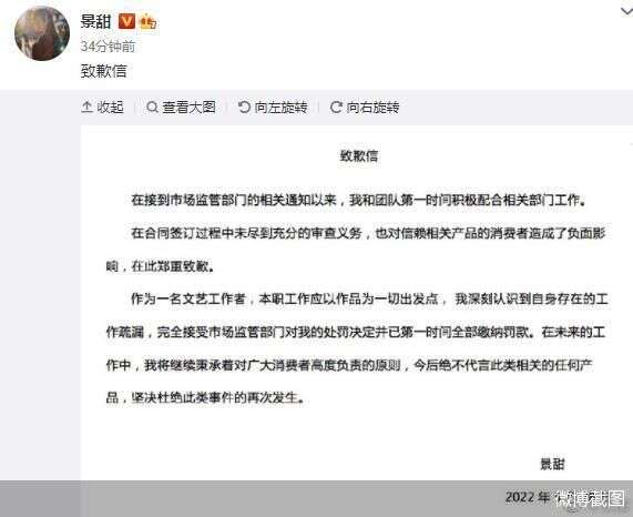 “在接到市场监管部门的相关通知以来,我和团队第一时间积极配合相关部门工作。在合同签订过程中未尽到充分的审查义务,也对信赖相关产品的消费者造成了负面影响,在此郑重致歉”。在国家市场监督管理总局的通报发出后,景甜通过官方微博发出致歉信,并称完全接受处罚决定并已第一时间全部缴纳罚款,今后绝不代言此类相关的任何产品,坚决杜绝此类事件的再次发生。北京商报记者也就此事联系景甜工作室,截至发稿时未得到回应。