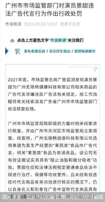 5月28日,国家市场监督管理总局官方微信对外通报了景甜违法广告代言一事。