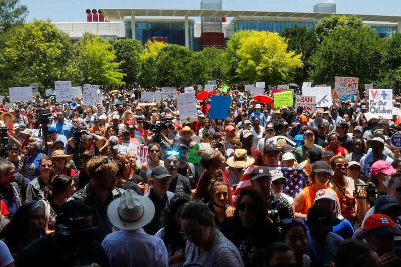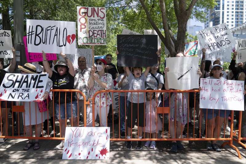 △5月27日,NRA年会在美国休斯敦乔治·布朗会议中心召开,会议中心外聚集了众多抗议者。(来源:路透社)