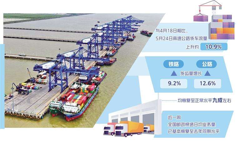 随着网络恢复畅通,全国交通主要运行指标实现稳中向好。数据显示,与4月18日相比,5月24日高速公路货车流量上升约10.9%;铁路、公路货运量分别增长9.2%和12.6%,均恢复至正常水平九成左右。近一周,全国邮政快递日均业务量已基本恢复至去年同期水平。