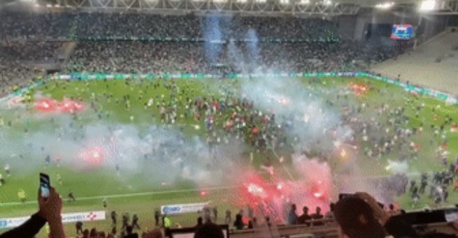 大批愤怒的主队球迷在点球大战结束后冲下看台试图攻击自家球队的球员。比赛现场直播的视频画面显示,双方队员第一时间冲回了球员通道,而大量的球迷一边冲向球场,一边朝着球员通道投掷烟火。