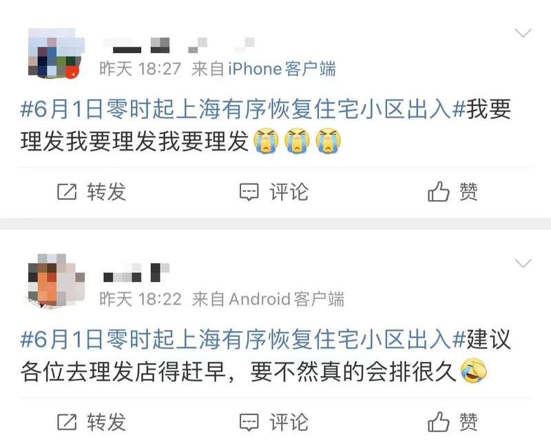 这一消息对于那些已经几个月没理发的上海市民来说,简直是喜大普奔,不少上海网友在微博上留言终于等到这一天了,“理发店速速开门,来消费了!”