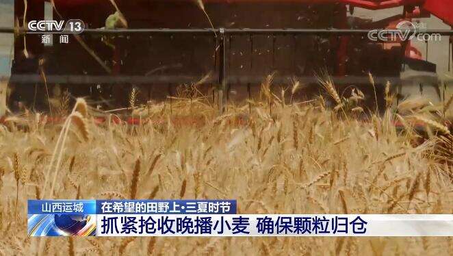 央视网消息:在山西运城,当地抓紧时间抢收晚播小麦,确保颗粒归仓。