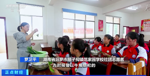在湖南省汨罗市一所学校里,孩子们正在社团课上学习包粽子,这成了孩子们学习传统文化的重要内容。