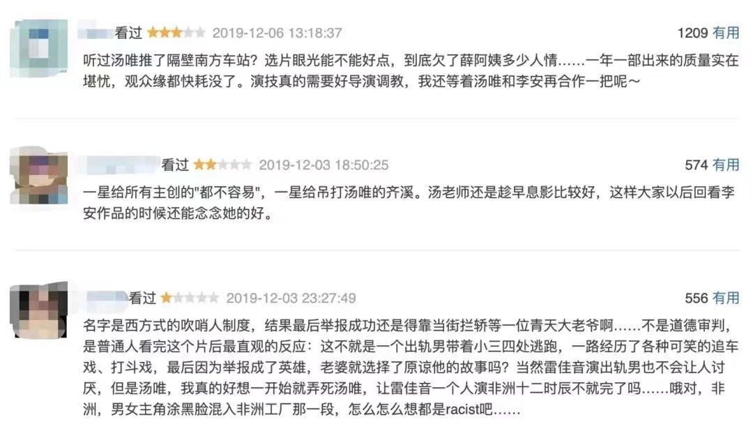 《吹哨人》的豆瓣评分5.3,高赞评论基本都和汤唯有关,比如希望她“趁早息影”,这样“大家以后回看李安作品的时候还能念念她的好”。