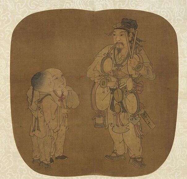 街头卖艺郎披挂琳琅满目的道具,施展他巧妙的技艺,鸣锣击鼓,并和着节拍,引来了儿童驻足围观。本幅为“烟云集绘”第三册中的一幅,无款印,属苏汉臣一路之画风。