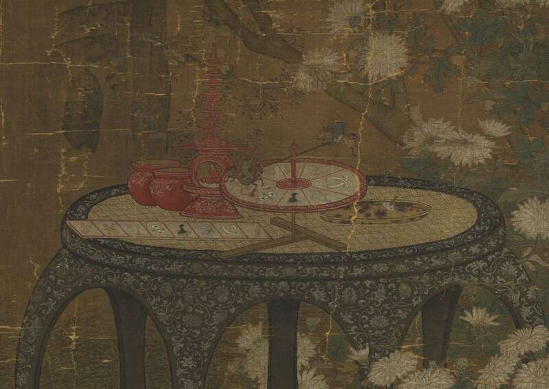 本幅绘湖石婷立,芙蓉、雏菊争艳,一派秋意盎然。姐弟二人,围立圆几,专注于拨玩枣磨。右方几上和地面,复散置转盘、佛塔、铙钹等。举凡人与诸物,率皆刻画细谨,敷染生动,洵为苏氏传世极精之作。