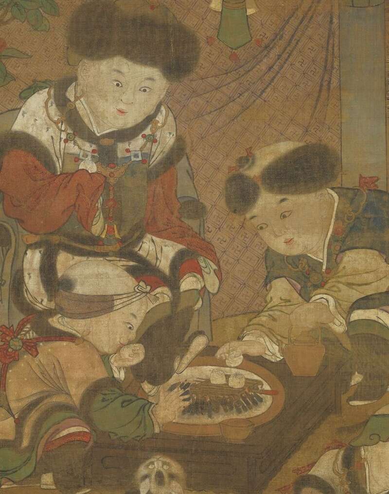 堂前婴孩三人围炉炙包子,一人在旁玩耍。狸奴旁待,希望能分享一份美食。包子热气直冒出,象征“同胞一气”之意。旁植山茶、白柚、水仙、雏菊。