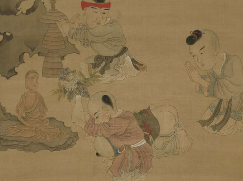 《童子礼佛图》描绘四名儿童搭佛塔礼佛的情景。图中一太湖石竖立,石前放一尊雕琢精致的佛造像和供佛用的铜塔。佛前,二儿童拜佛,一儿童献花,另一儿童跪着擦拭铜塔,各个神态专注,他们收敛起顽皮,显露出庄重,其中一名儿童磕头时露出胖臀,不免令人忍俊不禁。