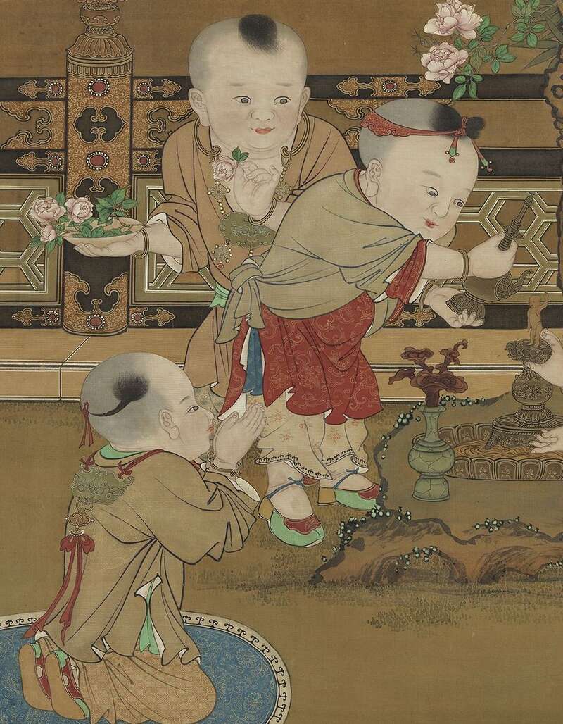 诗词之外,历代书画中亦不乏以婴戏为题的名家画作。如宋代苏汉臣的《秋庭婴戏图》轴,姐弟二人,围立圆几,专注于拨玩枣磨,两个孩子玩得着了迷,似乎忘记了刚才发生的一切;明代陈洪绶的《童子礼佛图》轴,二儿童拜佛,一儿童献花,另一儿童跪着擦拭铜塔,各个神态专注,他们收敛起顽皮,显露出庄重,其中一名儿童磕头时露出胖臀,不免令人忍俊不禁……