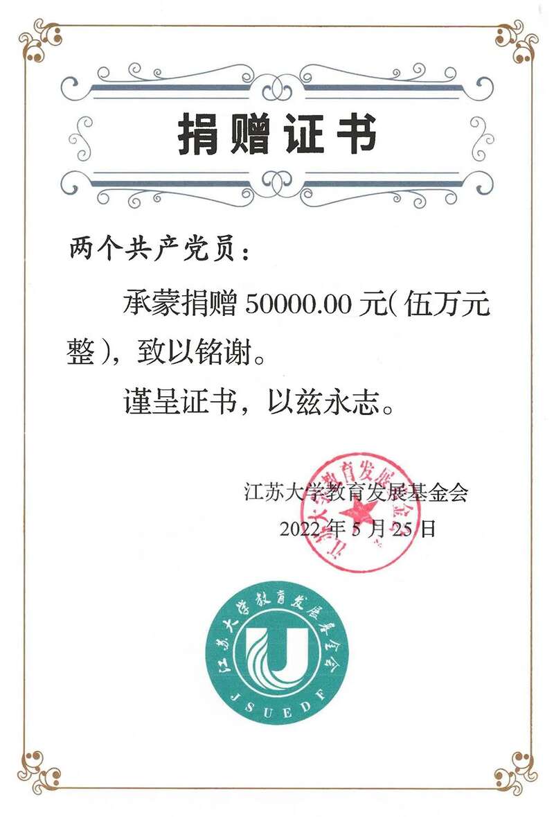 近日,江苏大学教育发展基金会又收到一笔5万元的捐款,捐款人的名字无比熟悉——“两个共产党员”。