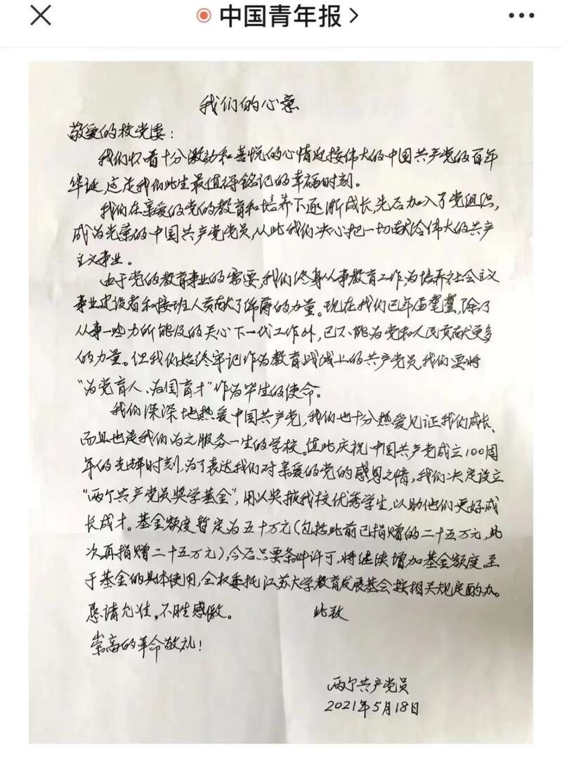 2011年起,学校每隔几年就要收到一笔捐款,数额多是5万元。但不变的是落款,始终是“两个共产党员”。去年,建党百年之际,他们曾一次性捐款25万元,10余年来共资助了72名学生。