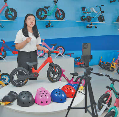 “六一”国际儿童节前夕,在河北邢台市平乡县童车玩具供应链直播基地,一名主播在网上销售童车和护具。 田晓丽摄(新华社发)