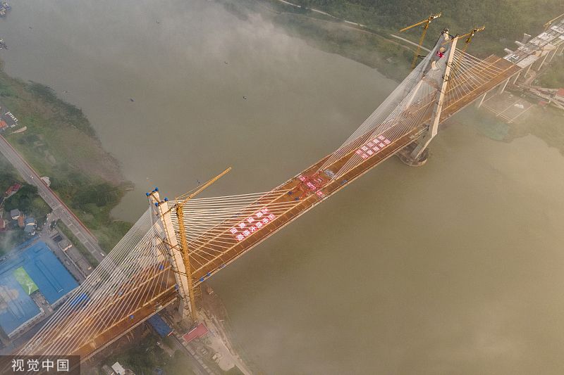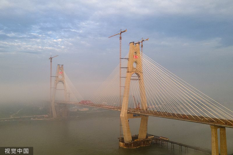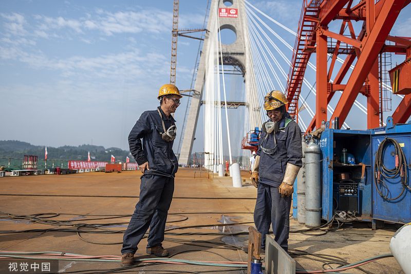 2022年5月31日,四川宜宾,宜宾临港公铁两用长江大桥合龙现场正在商讨焊接作业的工人师傅。当日,全长1742.1米的四川宜宾临港公铁两用长江大桥成功合龙。 中新社记者 刘忠俊 摄