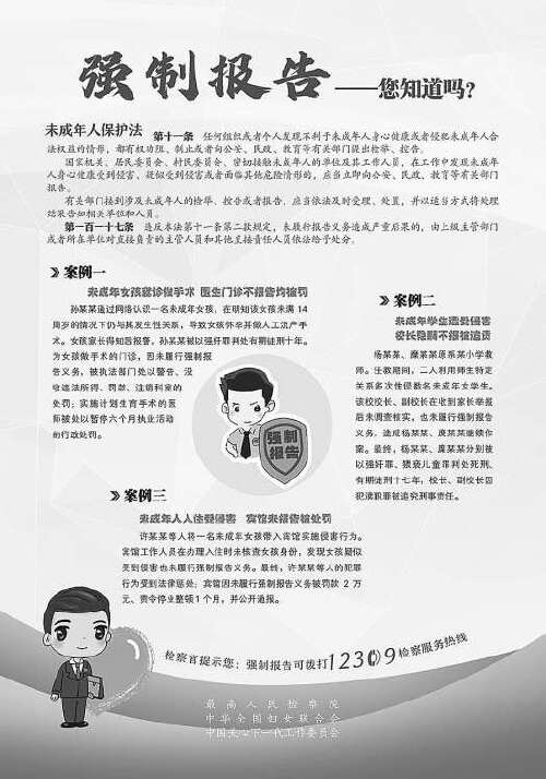 为进一步深化强制报告制度的普法宣传,促进这项制度深入人心,最高人民检察院、中华全国妇女联合会、中国关心下一代工作委员会共同设计制作了《强制报告》宣传海报。最高人民检察院第九检察厅有关负责人介绍,这套海报通过全网发布后,将走进国家机关、中小学校、医疗机构、社区、乡村等场所,让更多的人了解并落实强制报告制度。