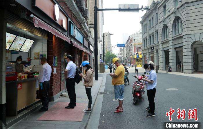 7点刚过,长宁区江苏路街头的蛋饼摊前一如往昔排起了购买早餐的队伍,大家自觉地戴着口罩,保持着2米的间隔距离。一旁的油锅里,油条滋滋作响还冒着升腾的热气,白领刘颖直接问老板要了4个蛋饼,“每个都加双份油条和肉松,另外再来4份豆浆”,这是刘颖给许久不见的同事们捎带的,“昨天她们发微信,说想念这个味道”。