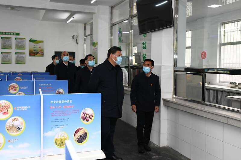 ↑2020年4月20日至23日,习近平在陕西考察。这是4月21日,习近平在安康市平利县老县镇中心小学食堂,了解学生伙食和复学后疫情防控情况。