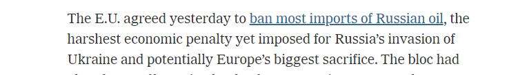 连《纽约时报》都评论称:“欧盟昨天同意禁止进口大部分俄罗斯石油,这是对俄罗斯作出的最严厉的经济制裁,其实也是欧洲做出的最大的自我牺牲。”