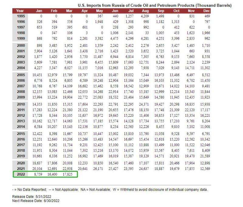 《今日俄罗斯》曾援引美国能源信息署(EIA)的报告称,3月19日至25日,美国从俄罗斯进口的石油量较前一周增加了43%。美国3月8日对外宣布,将对俄罗斯实施能源禁运,并停止从俄罗斯进口石油、天然气和煤炭。然而,美国财政部却将从俄罗斯进口石油、石油产品、液化天然气和煤炭交易的最后期限设定为4月22日。