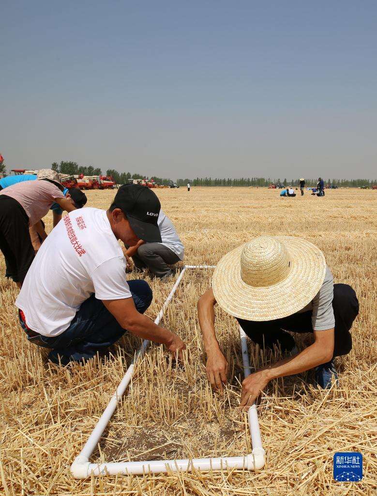 6月2日,在山东省临沂市郯城县郯城街道,裁判组工作人员在框取的测评区域之内捡拾麦粒,测算减损率。新华社发(张春雷摄)