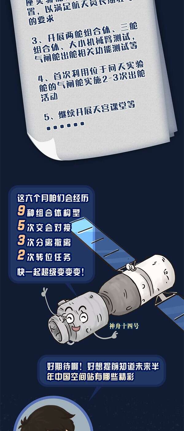 神舟十四号载人飞船成功发射,未来六个月,“新太空出差三人组”将面对哪些挑战?拆“盲盒”、过中秋、迎国庆,全面完成天宫空间站建造,还有哪些惊喜值得期待?想不想提前了解这些“高光时刻”?快坐上“时光机”一起去看看吧!