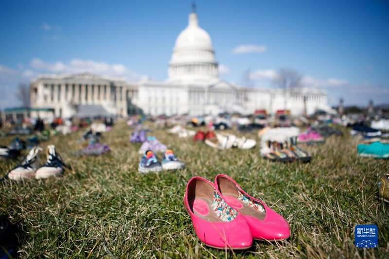 2018年3月13日,7000双代表自2012年美国康涅狄格州桑迪胡克小学枪击案以来枪击事件中遇难儿童的鞋子摆放在华盛顿国会山前的草坪上。人们以这种无声的方式,抗议国会面对枪击频发现状的不作为,呼吁枪支改革以保障儿童安全。新华社发(沈霆摄)