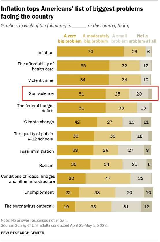 皮尤研究中心2022年4月进行的调查显示,有76%的美国人认为枪支暴力已成为美国面临的“很严重或比较严重的问题”。图片来源:皮尤研究中心网站截图