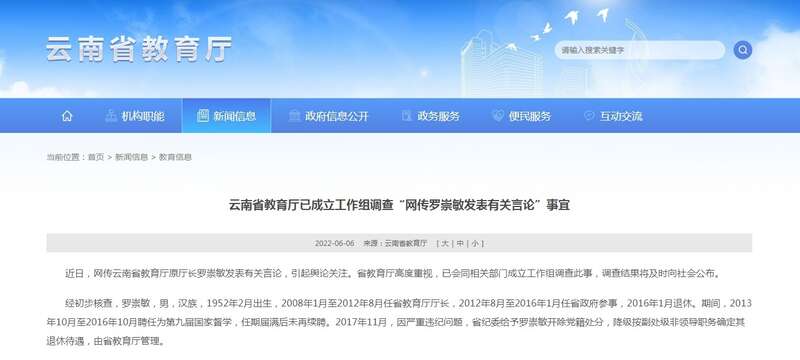 据云南省教育厅官方网站通报,近日,网传云南省教育厅原厅长罗崇敏发表有关言论,引起舆论关注。6月6日,云南省教育厅在官网上通报称,已成立工作组调查。