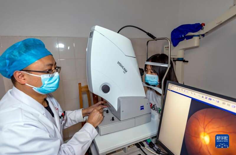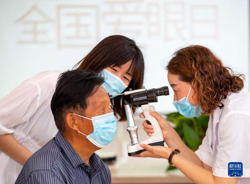 6月5日,河北省邢台市南和区人民医院医务人员深入乡村开展基层义诊活动,为贾宋镇苏史张村村民检查眼睛。