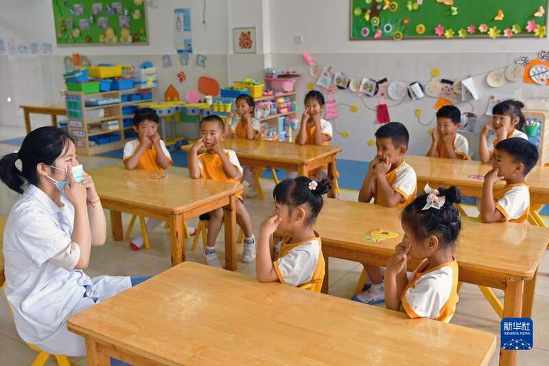 6月5日,在山东省烟台市福山区一家幼儿园,医务人员指导小朋友做眼保健操。