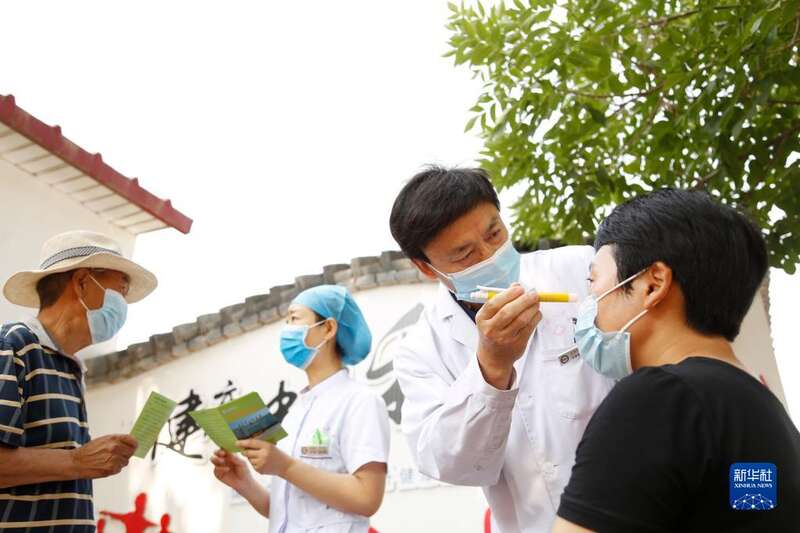 6月5日,在江苏省泰州市海陵区罡杨镇东楼村,医务人员为村民检查。