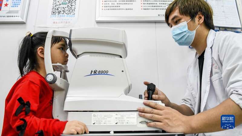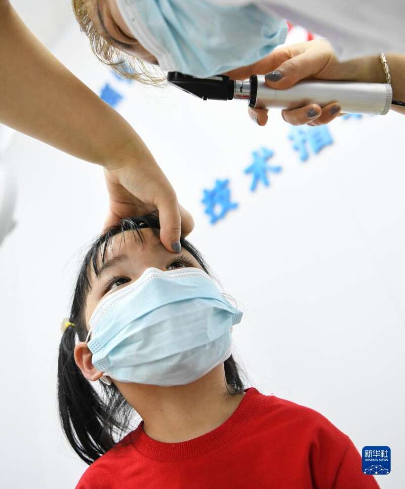 6月5日,湖南省常宁市第三人民医院的医护人员在为小朋友验光。