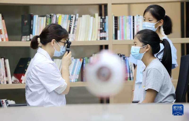 6月5日,在浙江省湖州市德清县武康街道新丰未来社区,医务人员为社区儿童检查视力。