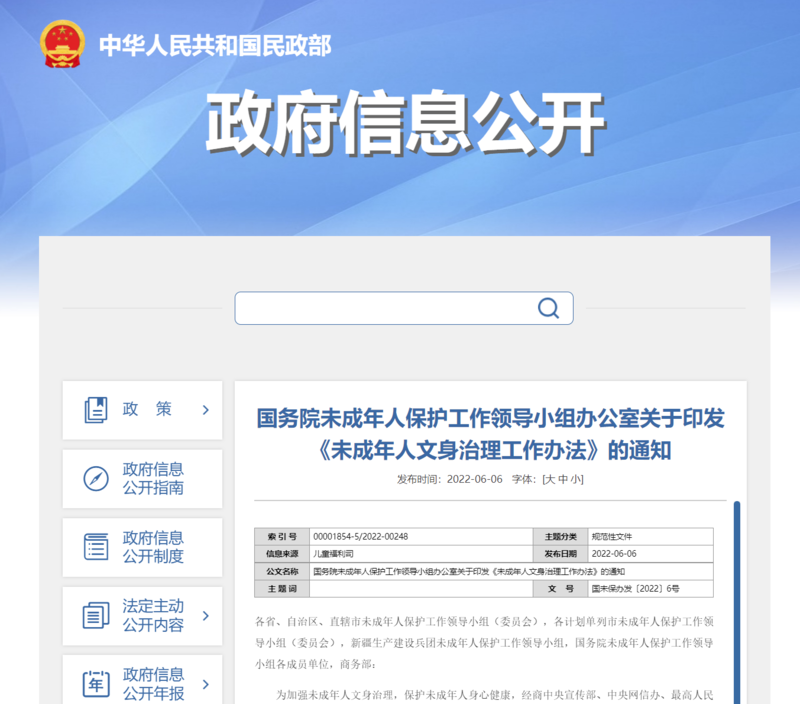 中国青年报客户端北京6月6日电(中青报·中青网记者 先藕洁)为加强未成年人文身治理,保护未成年人身心健康,国务院未成年人保护工作领导小组办公室经商中央宣传部、中央网信办、最高人民法院、最高人民检察院、教育部、公安部、民政部、司法部、商务部、卫生健康委、市场监管总局、广电总局、共青团中央、全国妇联达成一致,今天发布了《未成年人文身治理工作办法》(以下简称《办法》),对加强未成年人文身治理提出系列工作举措。