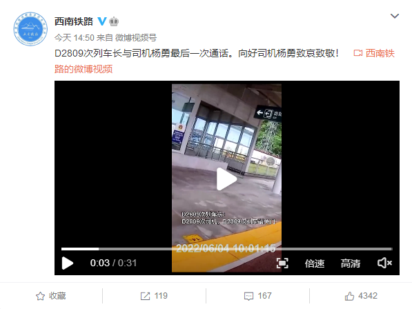 这是D2809次列车长与司机杨勇最后一次通话的录音。向好司机杨勇致哀致敬!