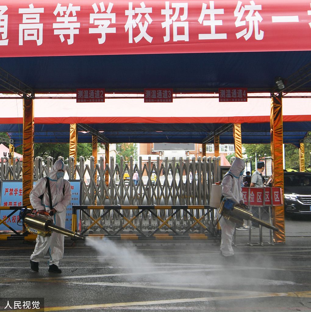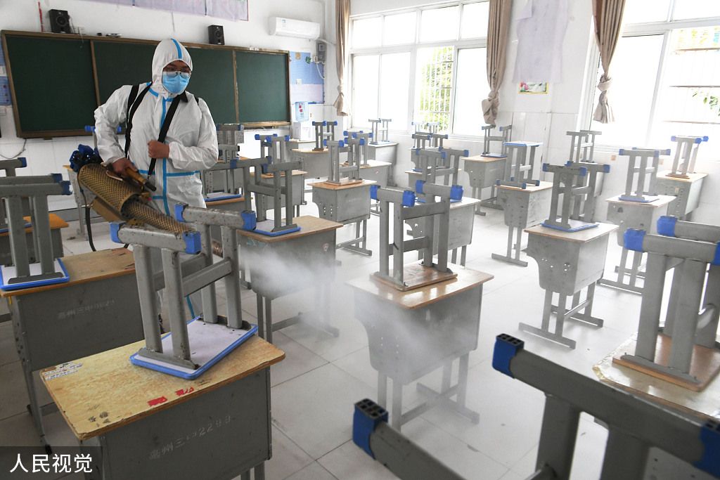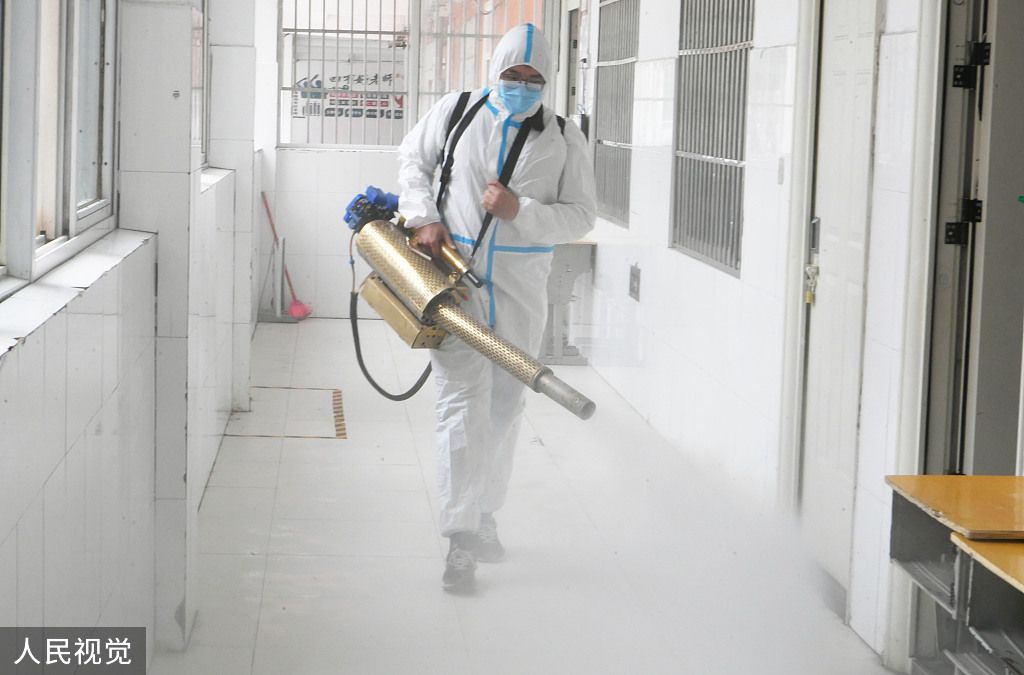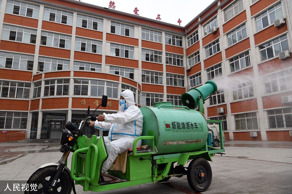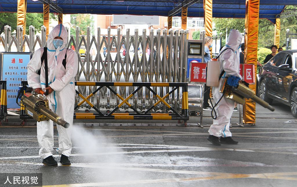 2022年6月5日,安徽省亳州市谯城区城市管理局环卫中心党员志愿者在第三中学进行防疫消杀作业。